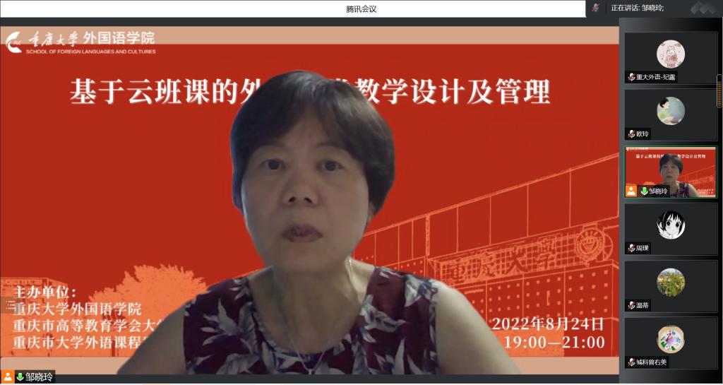 教授,主要研究方向为英语教学与英语教育技术、双语词典研究,出版词典、译注及教材40余部,发表论文30余篇。讲座中,邹晓玲教授首先简单介绍了云班课的主要功能,然后以实际课程为例深入浅出地分享了基于云班课的教学设计实例和教学管理经验,并为老师们提出了诸多实用的建议。同时,邹晓玲教授也与老师们一起交流了其近十年来在在线教学方面的研究与实践心得。
