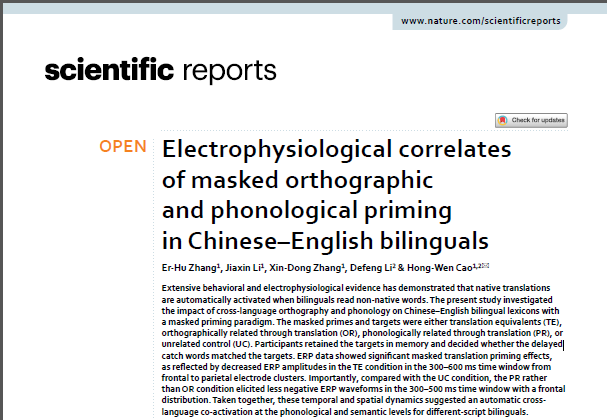 曹洪文老师团队在英国Nature出版集团(NPG)旗下综合性科学期刊《Scientific reports》(MULTIDISCIPLINARY SCIENCES, SCIE, IF:4.996, Q2)上在线发表题为“Electrophysiological correlates of in Chinese–English bilinguals”的研究论文。该论文第一作者为伦理电影