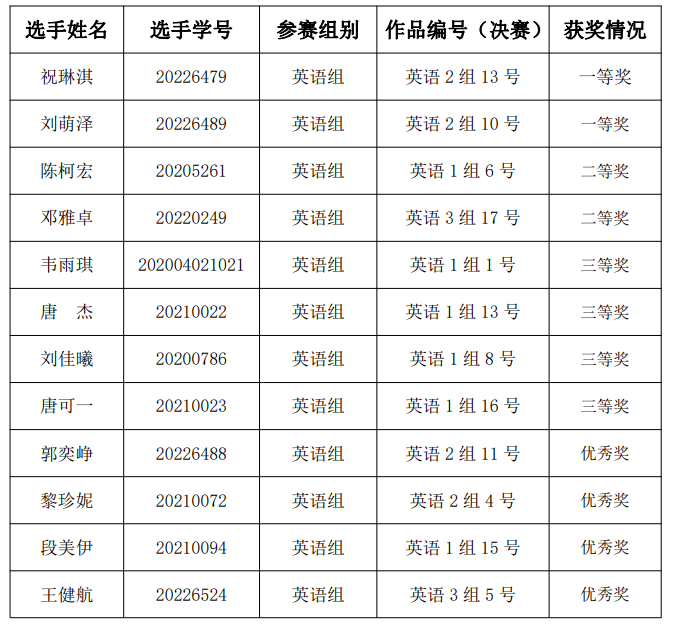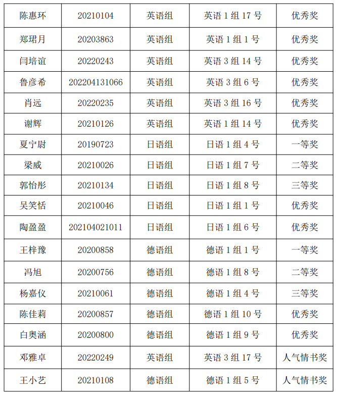 第二十二届外语文化节组委会审核通过, 拟评选祝琳淇等 30 名同学分获一等奖、二等奖、三等奖、优秀奖、 人气情书奖。现对获奖选手名单予以公示: