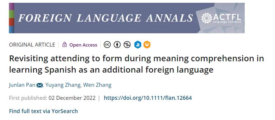 为第一通讯单位。该论文获英国约克大学开放论文出版资助,可开放阅读和免费下载()。研究使用的实验材料和实验数据均已上传IRIS语言研究方法资源库,获得了“开放材料”和“开放数据”两项开放科学徽章。此外,该研究的中、英文双语研究概要已被OASIS语言研究开放概要资源库收录。据Journal Citation Reports™2021显示,Foreign Language Annals为语言学类一区期刊,影响因子为2.976。