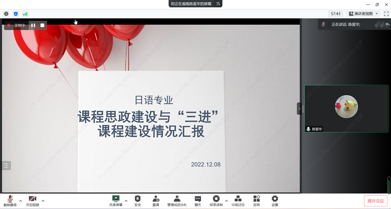 日语系以“课程思政建设暨‘三进’课程建设情况”为主题汇报了相关建设成果。陈爱华老师介绍了日语专业“三进”课程建设的建设目标、实施步骤以及课程设置基本原则。日语专业思政课程《理解当代中国》系列教材中对应课程为中心,以其他专业核心课程为辅助,将“三进”思想全面融入日语专业教学。目前日语专业有两门课程列入伦理电影
