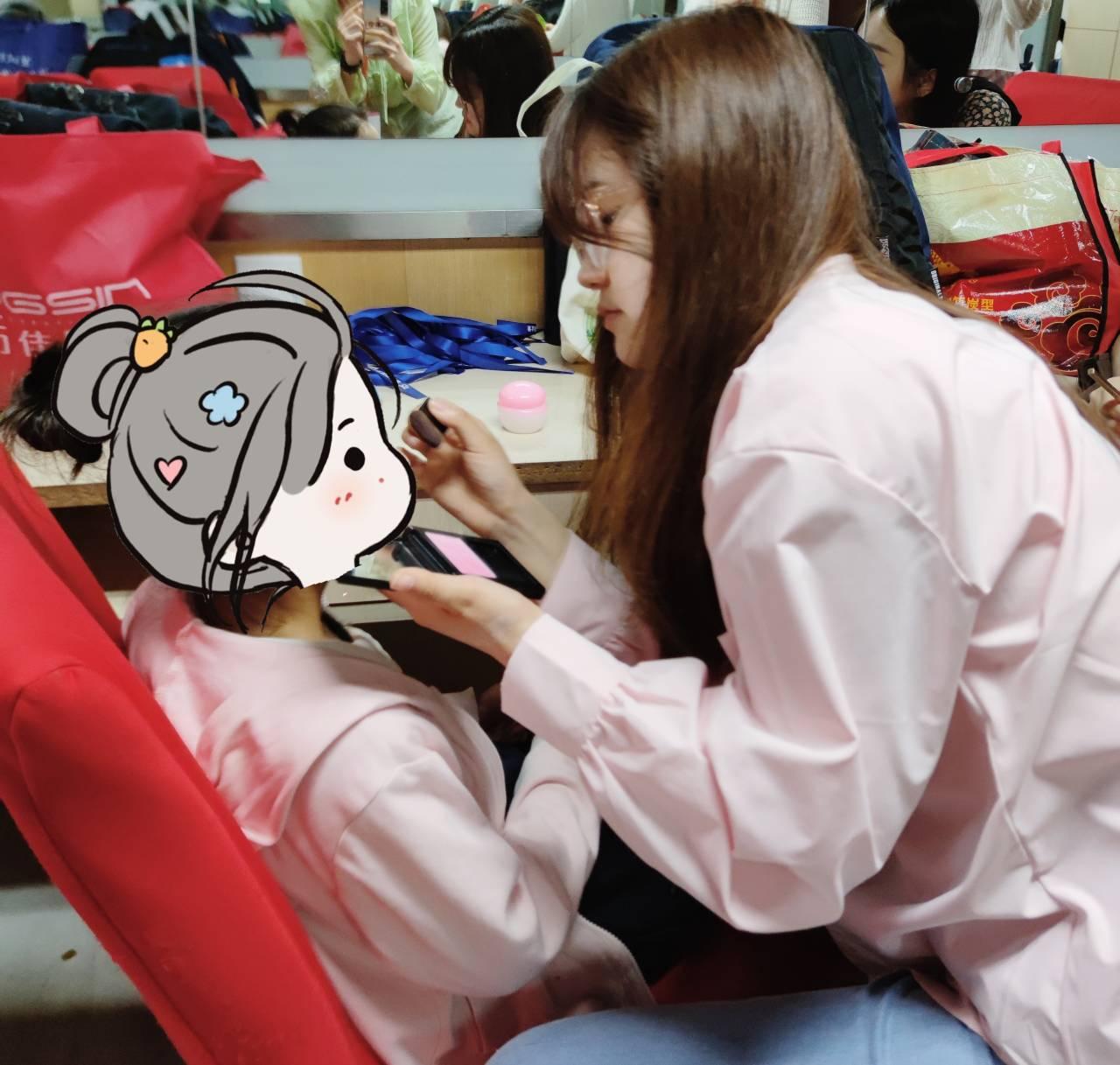 在与重庆市渝中区汇爱社会工作服务中心理事长唐毅教授沟通后,康鑫团队成员于4月2日下午3点到达国泰艺术中心为汇爱星星合唱团及重庆慧灵非洲鼓队的小朋友们和家长化妆。7位志愿者用亲切温和的话语引导小朋友耐心等待,用精湛熟练的化妆技艺将小朋友们和家长打扮得英俊美丽,化妆过程推进得顺利、有条不紊,化妆成果得到了家长们的一致好评。