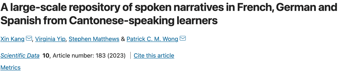 1.Kang, X.*,Yip, V., Matthews, S., & Wong, P. C. M.* (2023). A large-scale repository of spoken narratives in French, German and Spanish from Cantonese-speaking learners.Scientific Data,10(1), 1–9.