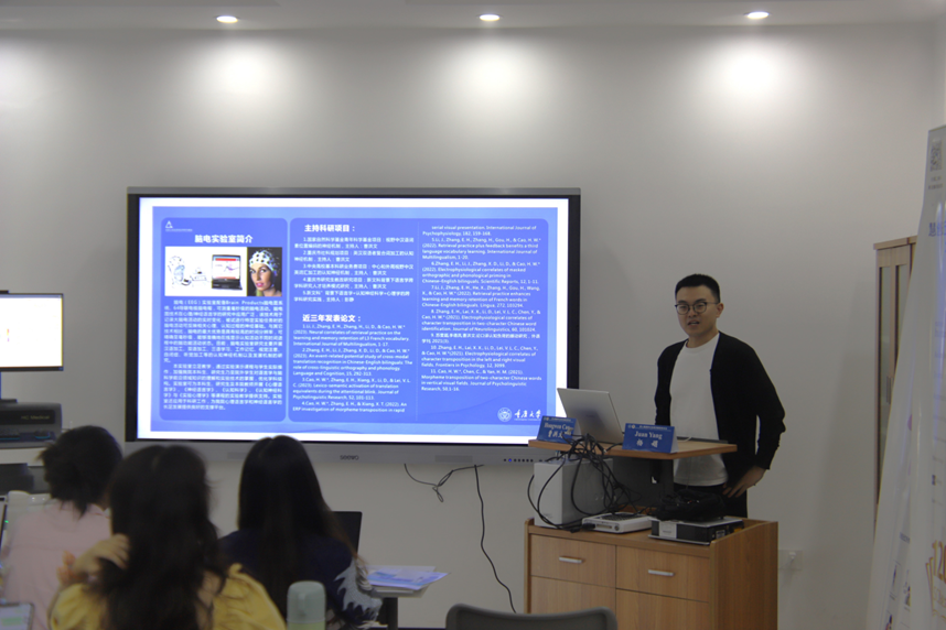 语言认知与语言应用研究基地脑电和近红外实验室的基本情况,以及团队近年来在翻译认知与脑科学领域所取得的研究成果。然后,曹老师指导的博士研究生张二虎同学在其研究的基础上介绍了事件相关电位(ERP)的基本原理与技术,以及利用该技术所取得的一些学术成果。此外,工作坊邀请到了四川师范大学计算机科学学院杨娟教授进行研究分享,杨教授介绍了其如何利用近红外功能成像技术(fNIRs)来探索英语课堂教学设计的实证研究。最后,来自北京飞宇星电子科技有限公司和丹阳慧创医疗设备有限公司学术部的工程师分别介绍了fNIRs和ERP数据采集的基本原理,以及在翻译认知领域的研究情况。在互动环节中,各位老师与大家交流了在研究中遇到的一些问题,同时也重点强调了方法只是辅助工具,如何做好研究更关键的是有好的想法,以及探索问题的积极性。