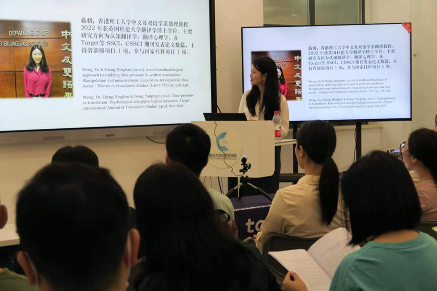 楼501会议室主持了题为“翻译认知与有声思维法”的工作坊。工作坊伊始,孙老师先简要介绍了翻译过程研究的发展历史,特别是研究方法的发展变化,进而引入本次工作坊的主题—有声思维法。活动中,孙老师针对有声思维的应用领域、分类、发展历史和现状等方面,以自己的研究为例,进行了详细的讲解。接着,在实际操作方面,孙老师还细致讲解了有声思维的具体操作步骤、注意事项、分析方法及工具等知识。最后,孙老师对比了两款有声思维分析工具Translog和Inputlog的特点并现场进行了操作演示。