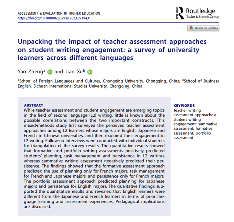 教师郑尧博士和四川外国语大学徐建博士在SSCI教育与教育研究一区期刊Assessment & Evaluation in Higher Education(2021年影响因子/JCR分区:4.44/Q1)上合作发表学术论文“Unpacking the impact of teacher assessment approaches on student writing engagement: a survey of university learners across different languages”。郑尧博士为论文第一作者,论文为其主持的国家社会科学基金项目“积极心理视域下中国外语学习者多语写作投入的多维度动态研究”(21CYY018)阶段性研究成果。