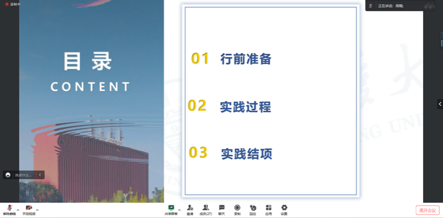 会议第一部分,张赢方同学讲解了实践结项中实践报账的详细要求及注意事项。她重点强调了实践活动中和实践活动后期统一报账的资料提交,为暑期参加社会实践的团队或个人梳理清楚了报账条件。