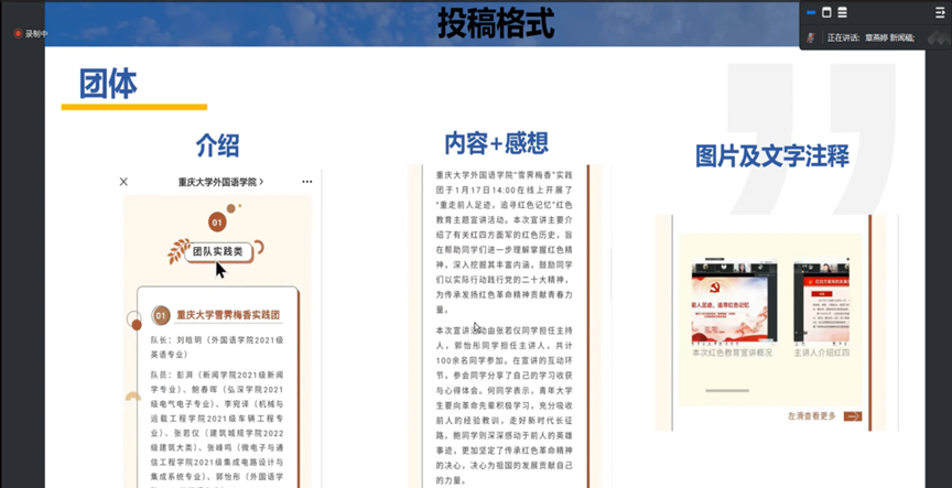 会议第二部分,章燕婷同学讲解了团队或个人结项时新闻稿投稿格式要求,从介绍、内容感想、图片及文字注释四个方面分别举例说明,同时介绍了新闻稿投稿命名的相关要求。
