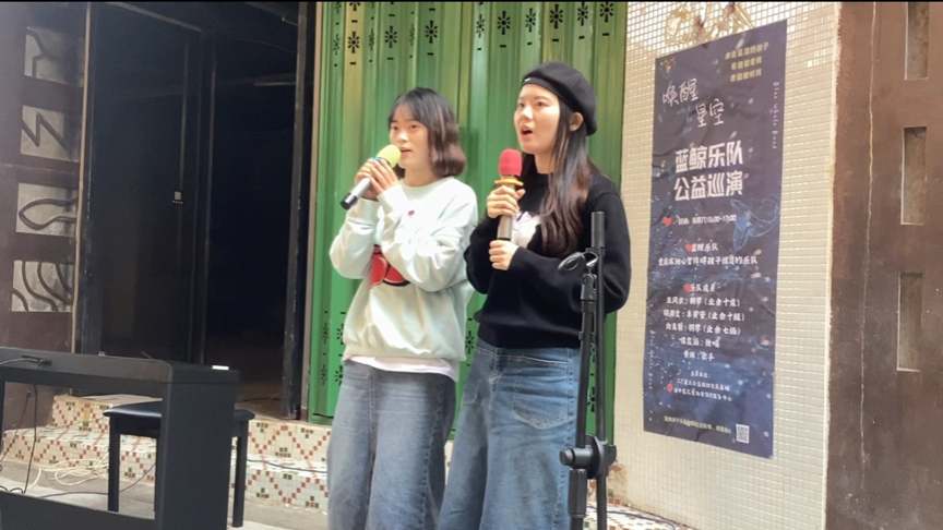 2023年10月28日,语言科学与障碍康鑫团队成员张雅倩、赵巧尧带领陈璇驰等志愿者前往鹅岭二厂下沉广场开展重庆“汇爱”蓝鲸乐队演出的志愿服务,承担主持节目、助演、现场宣传等任务。