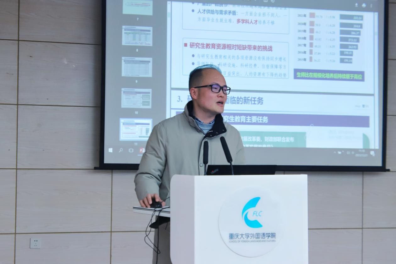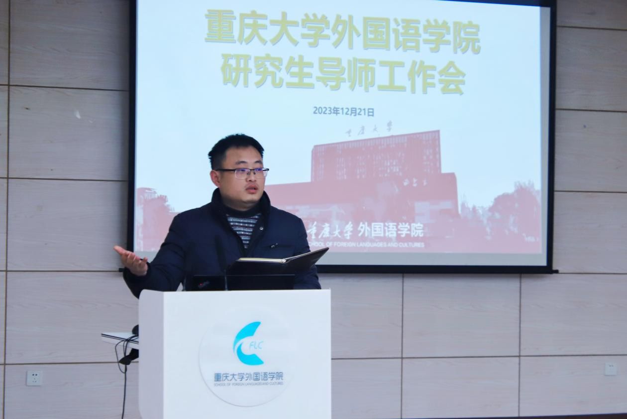 学位授权点概况、2023年度研究生培养主要环节情况、2023届毕业生去向等方面详细介绍了本年度学院研究生教育工作的基本情况,并对下一年度重要工作做出部署。他表示,未来学院将从几个方面提升研究生培养质量:一、完善培养环节,探索增设研究生必读书目考试环节;二、优化培养方案,凝练课程建设特色;三、构建各方向导师团队,促进学科集群建设;四、强化留学生管理,提升留学生教育质量。最后他强调,学位论文质量是学位点建设的生命线,导师应该加强对学生论文写作细节问题的关注,坚决避免出现问题论文,同时介绍了学院研究生教育指导委员会和研究生教育督导团队的职责功能,以及下一年度学位论文等工作的相关安排。