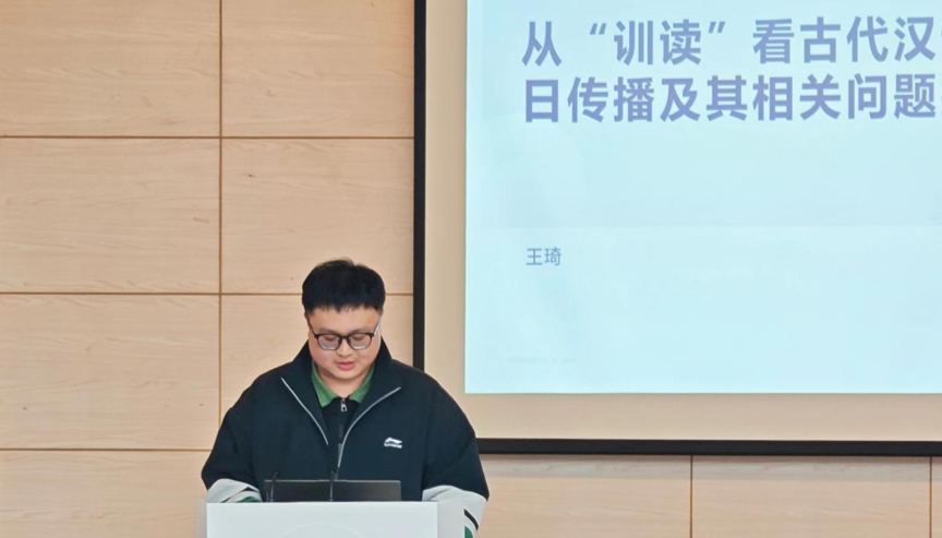 在研究生学术分享环节,研二的王琦同学以“从‘训读’看古代汉语在日传播”为题,就训读的概念、训读的过程及其研究价值等进行了介绍,并进一步分享了值得关注的研究视角,如教育史视角下的训读和素读、近代化背景下的白话文“训译”研究、翻译理论下的“训读”研究及“语言接触下的“训读”研究等,最后分享了推荐书单。