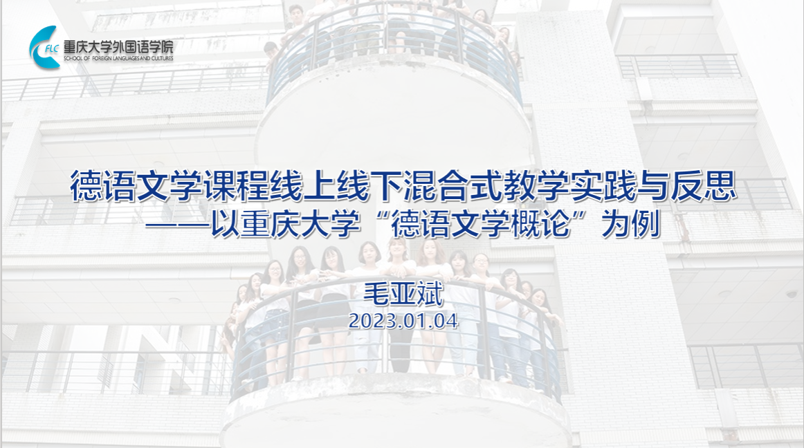 ‘德语文学概论’为例”,毛亚斌老师基于外语学科“混合式教学与学习”的发展趋势,探讨了外语教学“SPOC”与“MOOC”平台的运用场景和各自的优势与限制,并以“德语文学概论”课程为例,阐述了文学课程混合式教学改革的动机、背景、具体形式以及教学反思。
