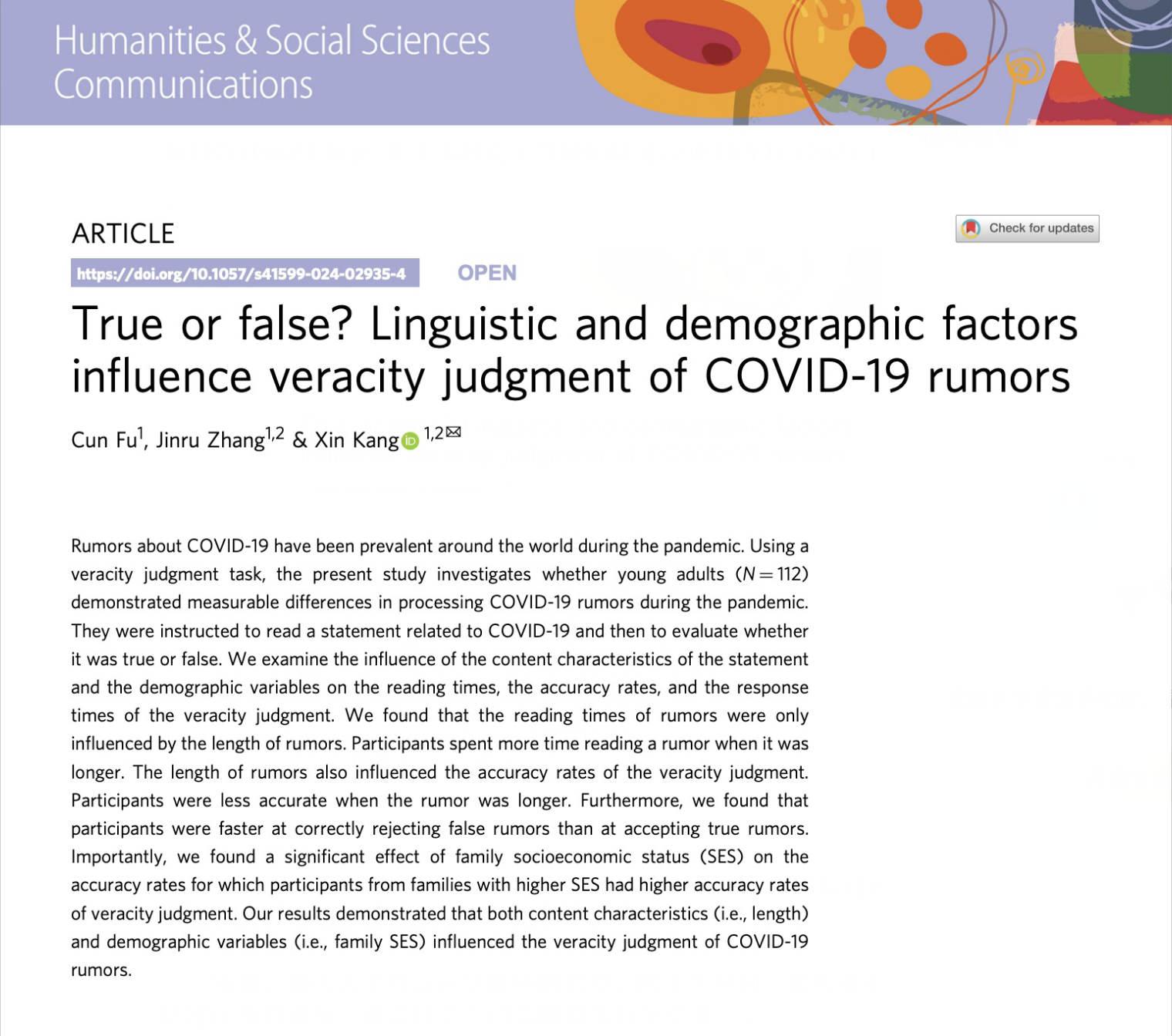 论文引用方式:Fu, C., Zhang, J., & Kang, X.* (2024). True or false? Linguistic and demographic factors influence veracity judgment of COVID-19 rumors. Humanities and Social Sciences Communications, 11(1), 1–7.