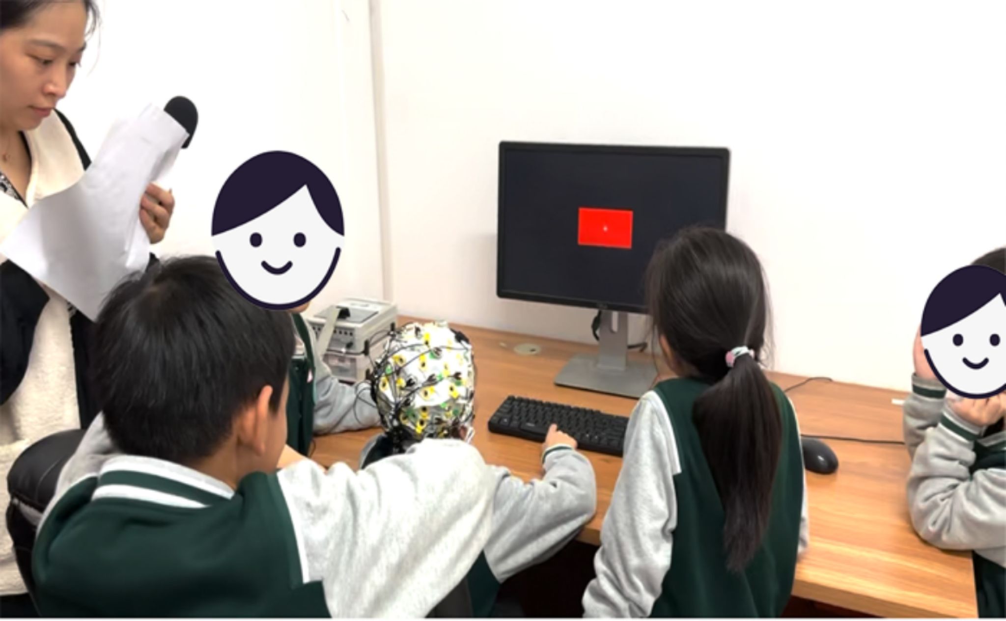 孩子们体验了心理语言学实验,包括考察工作记忆的行为实验、考察认知控制能力的脑电实验、快速命名及新词学习的眼动实验。
