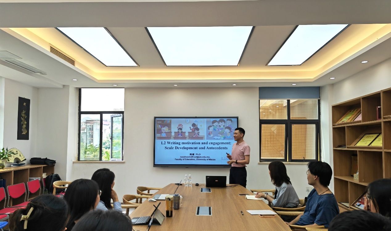 举行了“青年教师学术沙龙”第三期活动。澳门大学教育学院周楠副教授为师生们带来了一场题为“二语写作动机与投入:量表开发及前因”的精彩学术沙龙。本次学术沙龙由学院郑尧副教授主持,吸引了众多青年教师、硕博研究生和本科生的积极参与。