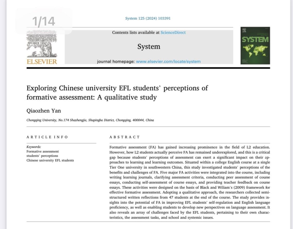 青年教师颜巧珍在语言学类SSCI期刊System发表学术论文。该论文题目为 Exploring Chinese University EFL Students’ Perceptions of Formative Assessment: A Qualitative Study,颜巧珍老师为论文唯一作者,论文受伦理电影