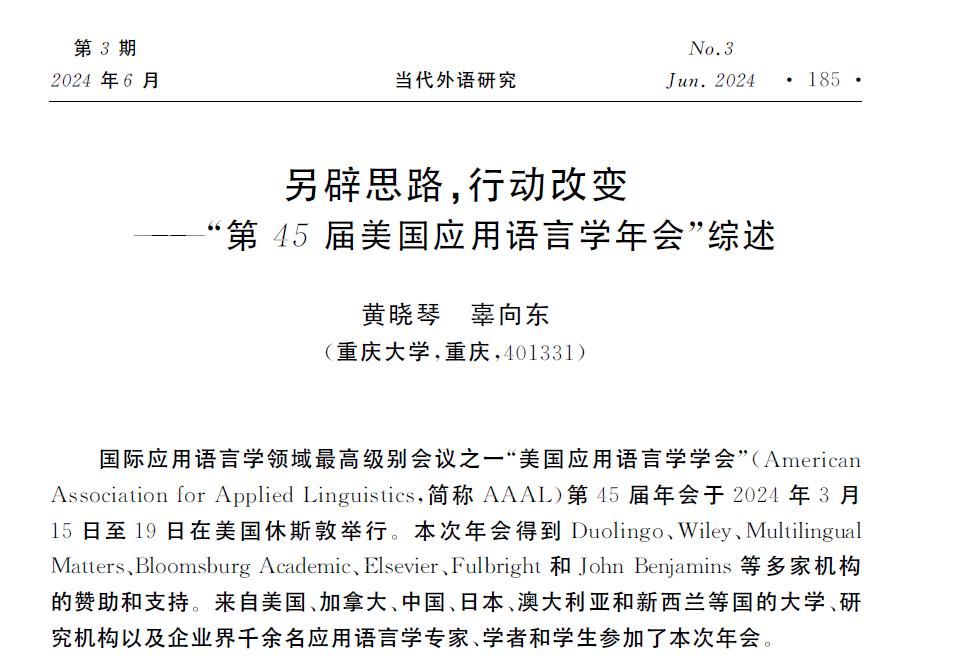 会议综述来自黄晓琴第45届美国应用语言学年会(American Association for Applied Linguistics,AAAL)参会体验,结合会议主题探讨了新时期应用语言学研究实践公平性和多元化等前沿议题,梳理了多语时代应用语言学的最新成果,并总结了未来研究趋势,包括重视语言教育与教学,强调批判性思维与包容性,深入探索语言研究与分析,拓展对二语/多语现象的研究,以及关注语言与社会之间的互动,进一步拓展研究方法的社会维度。