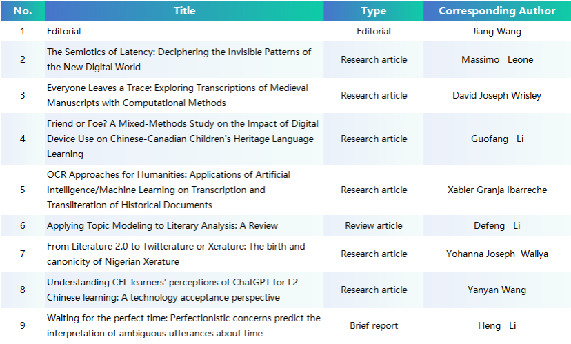 这八篇创刊号稿件内容充分涵盖数字技术在语言、文学和翻译研究中的多个方面:从符号学对数字世界隐形模式的解码,到中世纪手稿的数字化转录;从数字设备对母语学习的影响,到主题建模在文学分析中的应用;再到尼日利亚Twitterature的经典化过程和中国外语学习者对ChatGPT的接受度研究,这些文章展示了数字技术在不同学术领域中的创新应用和深远影响。