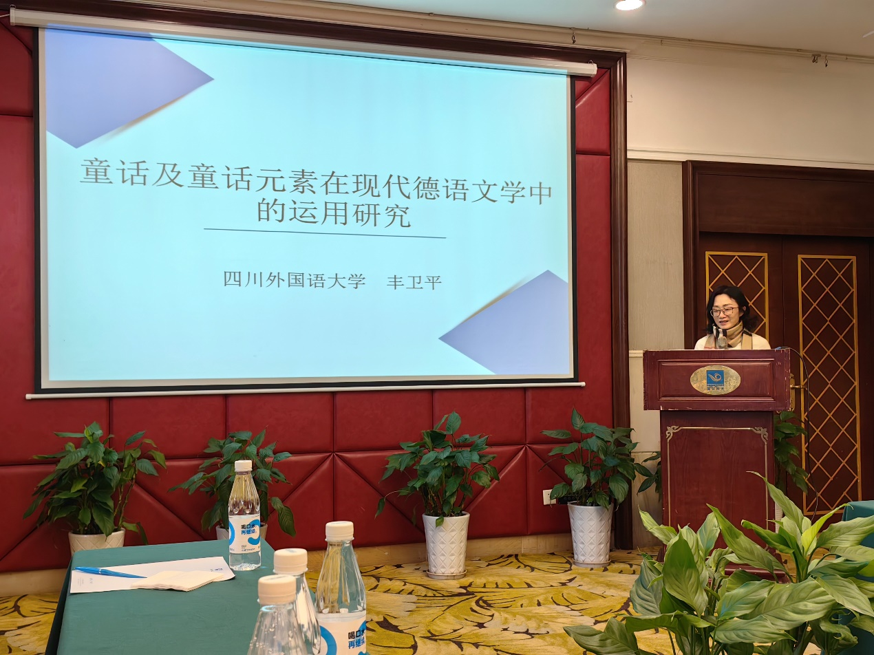 在主旨报告阶段,共有四位专家做了五场发言,分别涉及德语文学、意大利语文学、比较文学、俄语文学和法语文学。四川外国语大学丰卫平教授的演讲题目是《童话及童话元素在现代德国文学中的运用研究》。