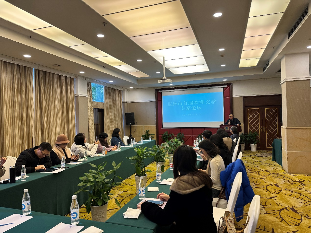李永毅教授领衔的重庆市“欧洲语言文学”专家工作室在海兰云天海琴酒店举行了首届专家论坛。“欧洲语言文学”专家工作室于2023年11月由重庆市人力资源服务授牌成立,是目前重庆外语学科的两个首席专家工作室之一,旨在团结和整合重庆市欧洲语言文学研究的人才,促进中西经典文化的传承与传播。学院欧玲书记、杨小虎副院长、基地主任彭静教授、工作室部分学术委员和成员参加了此次论坛。