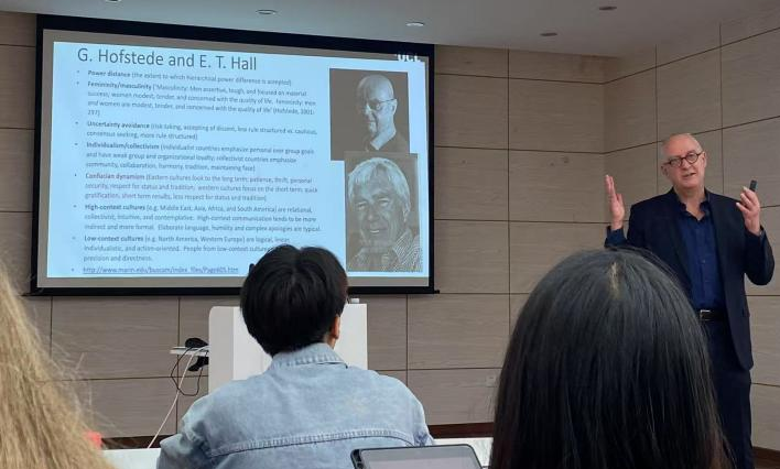讲座中,敖睿港教授强调,在一个资本、技术、思想、信仰、信息和人员全球流动的世界,跨文化交际以及跨文化能力的培养,在围绕全球竞争力、全球公民意识、国际化进程、多语言现象、多元文化主义、冲突解决等诸多议题的讨论中占据了核心地位。本次讲座详细介绍了研究方法如何影响跨文化交际教育与培训。