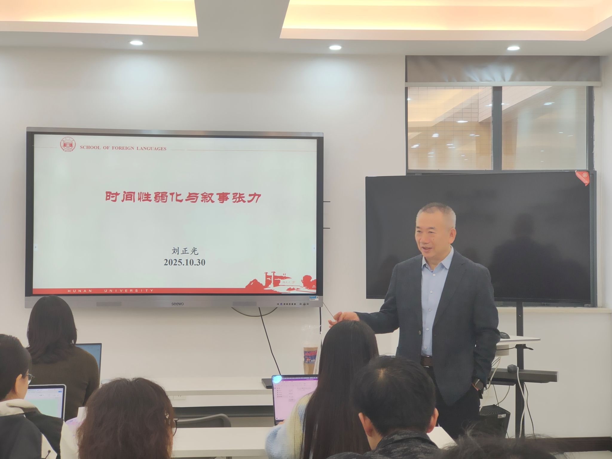 2025年10月30日上午,湖南大学刘正光教授应邀在UC联合学院楼422会议室作了主题为“时间性弱化与叙事张力”的学术讲座。报告由 伦理电影