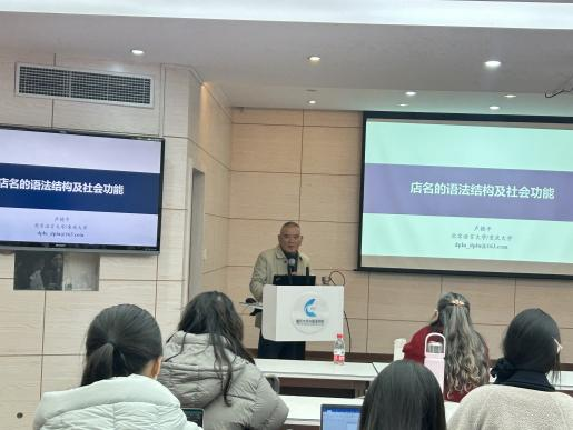 ,作题为《店名的语法结构及社会功能》的学术讲座。本次讲座由刘扬教授主持,吸引了国际中文教育专业众多师生参与,共同聚焦语言景观研究的前沿议题。讲座伊始,刘扬教授对卢德平教授的莅临致以热烈欢迎,并系统阐述了卢教授在社会语言学、语言哲学及语言景观领域的学术建树,指出其研究深度融合理论思辨与实证考察,为当代语言学研究提供了重要范式。他期许本次讲座能透过微观的语言景观样本,揭示其背后宏大的社会语言学生成逻辑与文化意指实践。