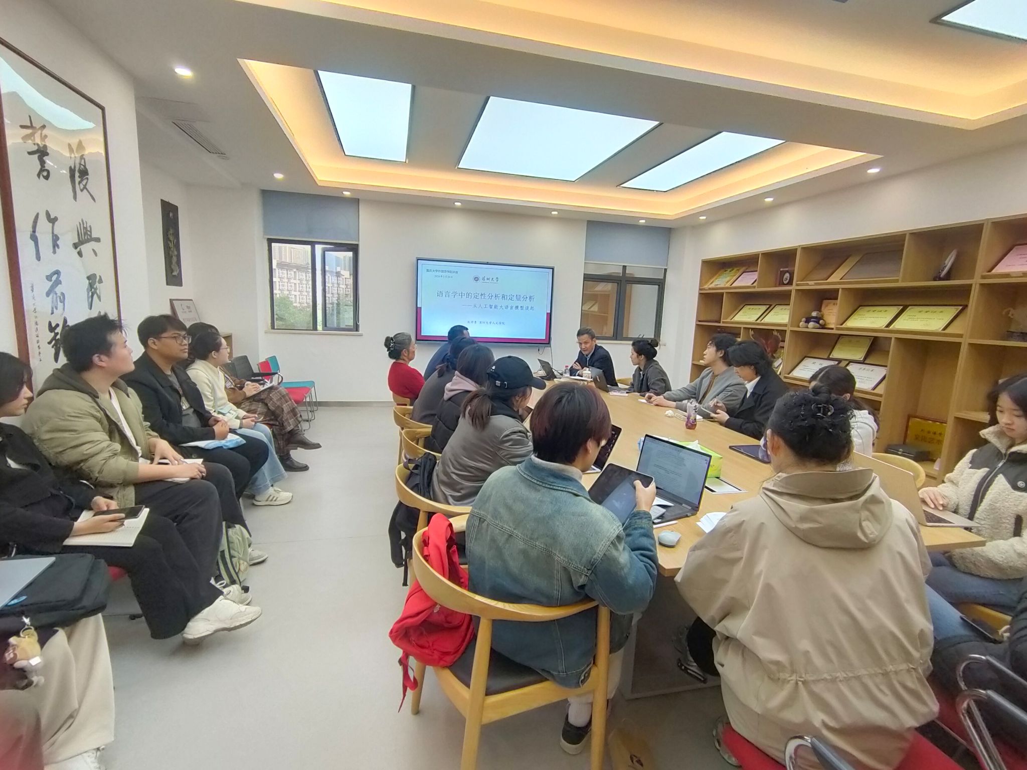 在交流互动环节,与会师生围绕语言学界对定性定量的讨论、库藏语言学向刘教授请教。刘教授逐一耐心解答。此次座谈会不仅为外语学院师生提供了与顶尖学者面对面交流的宝贵机会,也为大家在研究方法论层面带来了深刻的启发。