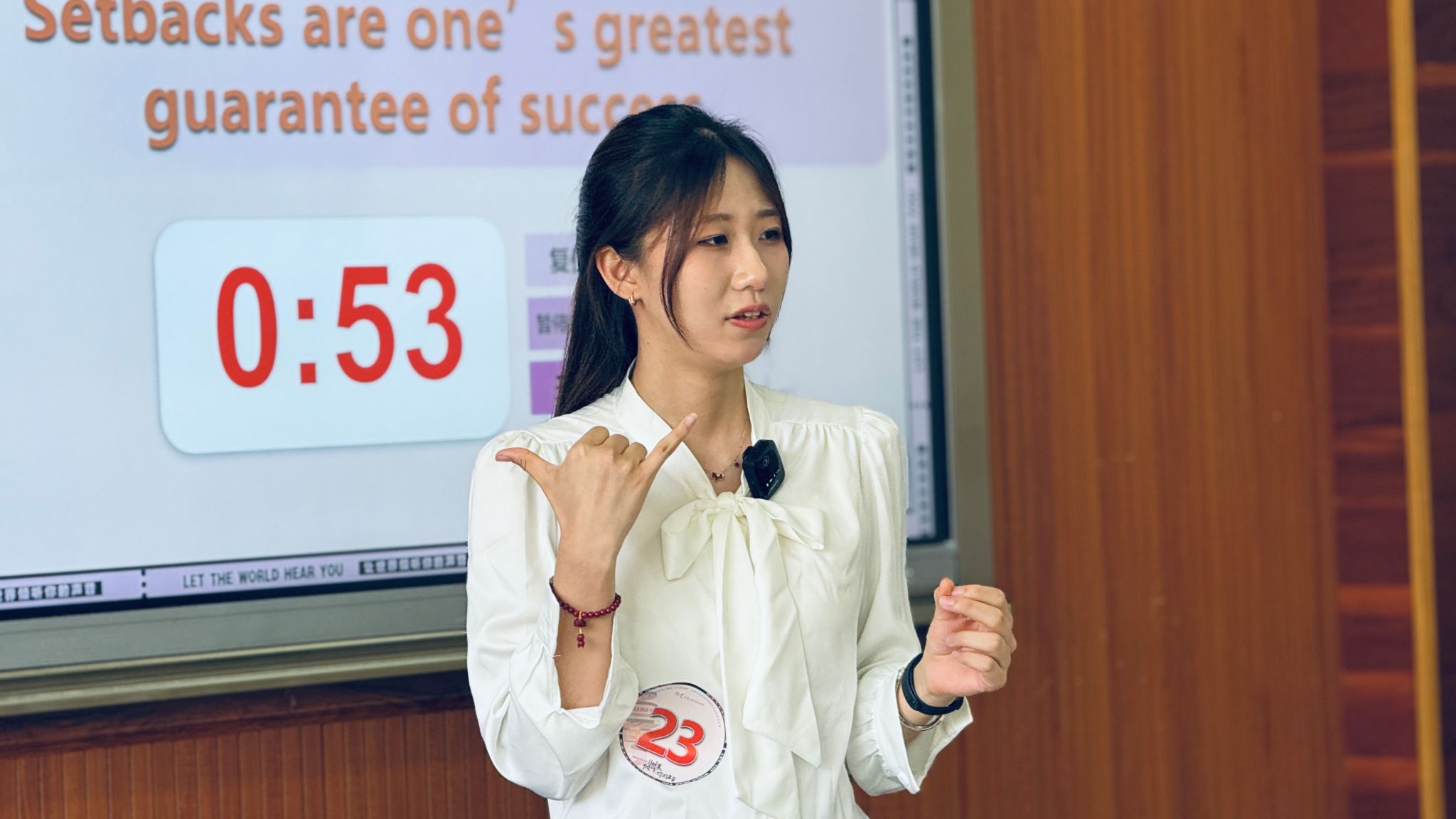 在已备演讲环节,选手们围绕主题“Setbacks are one’s greatest guarantee of success”,从个人成长、人生选择、社会发展到时代使命等多个角度切入,深入阐释了自己对“挫折”与“成功”关系的理解。无论是结合自身经历讲述在困境中突破、在失败中重拾信心的成长故事,还是立足历史人物与社会现实论证挫折如何塑造意志、磨砺品格,抑或从更广阔的时代背景出发探讨当代青年如何在不确定性中坚定方向、在逆境中积蓄力量,选手们都以真挚的情感和清晰的逻辑,展现了新时代大学生对奋斗、成长与成功的深层思考。