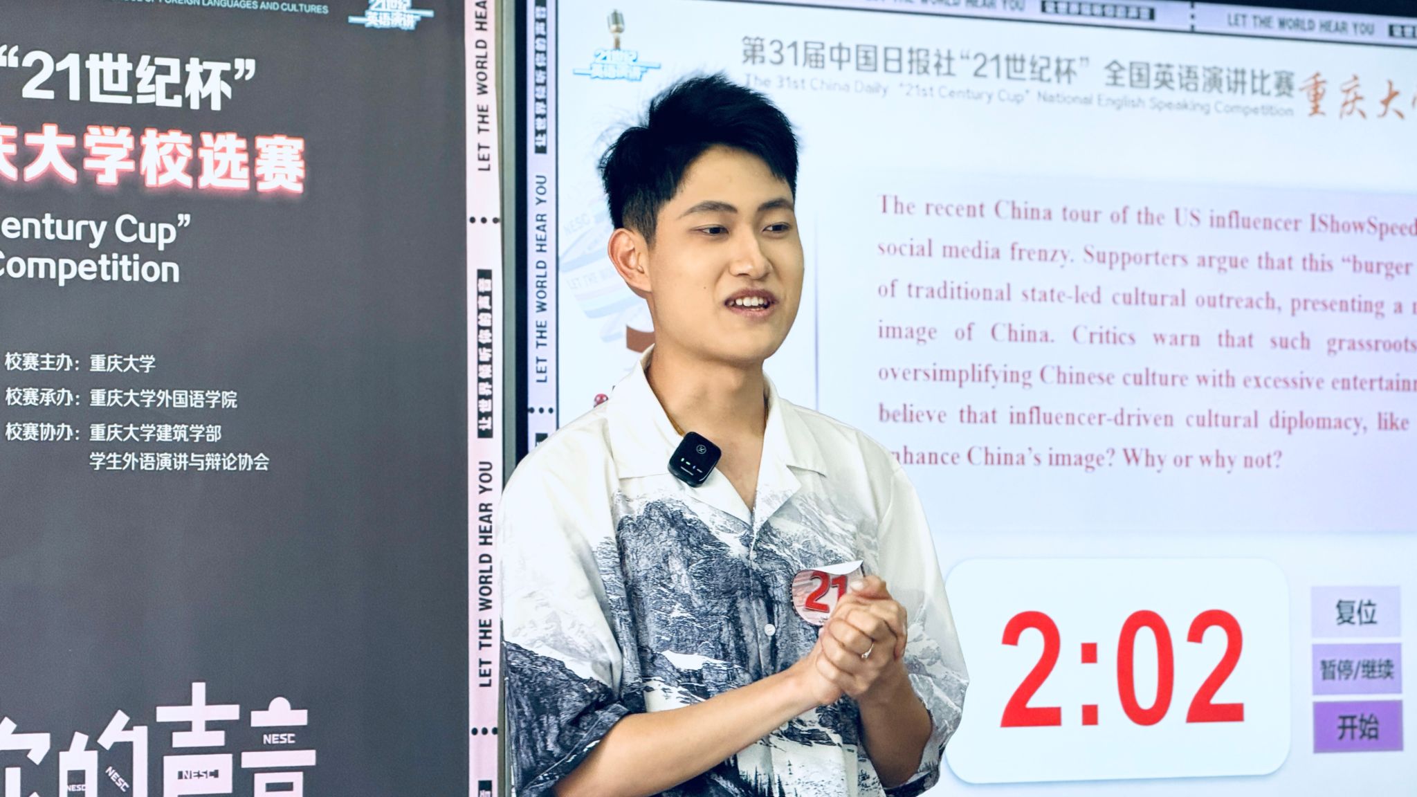 建筑学部、学生外语演讲与辩论协会协办。比赛分为线上初赛和线下决赛两个阶段,共有来自全校25个学院近40个专业的学生参赛,最终23位选手晋级现场决赛。