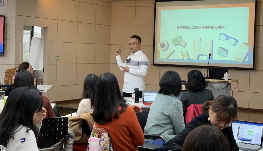 于书林博士在22日下午及晚上的两场讲座中,集中就写作教学研究中的资源、议题与方法论;写作反馈投入研究的研究议题、方法与实践与在座教师们进行了分享。在第一场有关于写作教学研究的报告中,于博士向大家呈现了国内外第二语言写作教学研究的主要议题与方法,重点分析了如何从大量的写作数据中挖掘研究选题,选择合适的研究方法,以解决二语写作教学实践中的关键问题。报告还详细介绍了二语写作教学研究的相关数据库、期刊和学术会议等相关资源,并分享了他自己二语写作研究论文发表的经历和策略。在第二场有关于写作反馈投入研究的报告里,于博士向大家呈现了三项关于二语写作反馈投入的研究,分别关注本科生、硕士生和博士生对于教师反馈、同伴反馈以及期刊审稿人反馈的行为、认知和情感投入问题,并探讨了质性个案研究方法如何揭示学习者与写作反馈的深层互动关系。在报告会后,参加工作坊的老师还与于博士进行了现场交流。