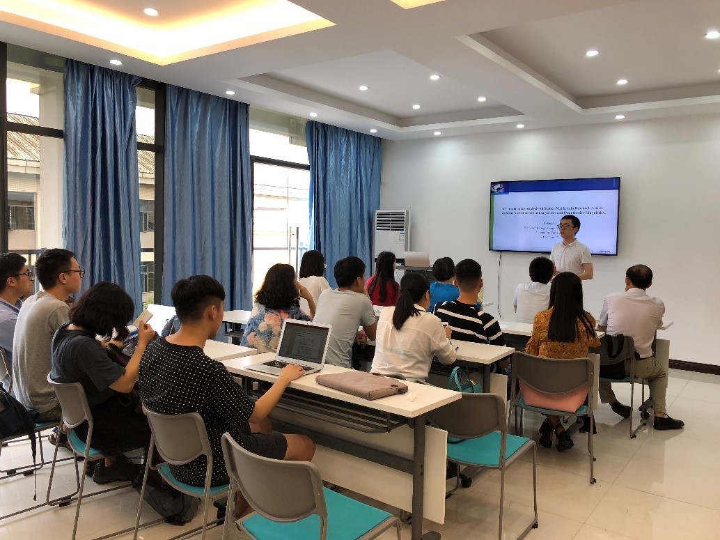 主题一为“立场标记语的亚学科使用异同——以理论语言学和计量语言学为例”,由李金凤同学主讲,主要介绍如何以理论语言学和计量语言学为例,探讨同一学科内部亚学科立场标记语的使用异同。主题二为“跨学科学术论文引言中转述动词的使用情况”,由喻璇同学主讲,报告主要以机械、哲学、经济学科为例,探讨不同学科之间转述动词使用的异同。两位同学报告结束后,与现场老师和同学就学术论文写作相关话题展开了热烈的讨论。