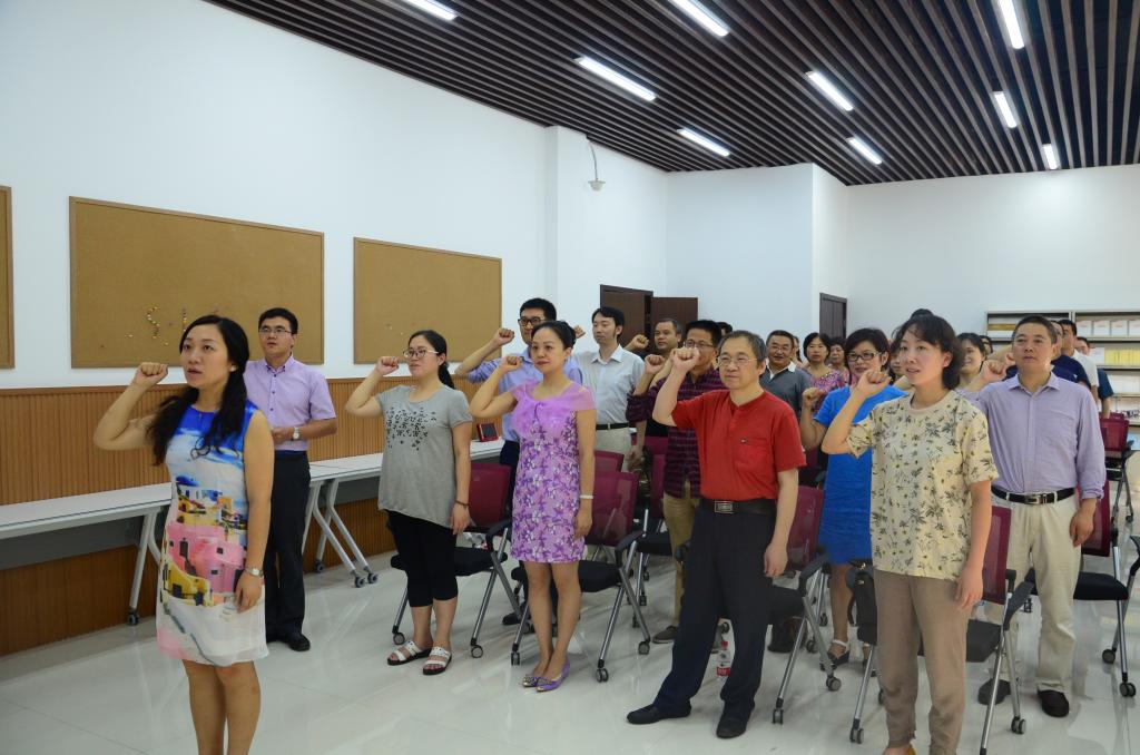 党委组织全体教职工党员和入党积极分子在学院党建活动室开展了以“增强党性修养,勇当时代先锋”为主题的重温入党誓词活动,活动由党委副书记何建华同志主持。