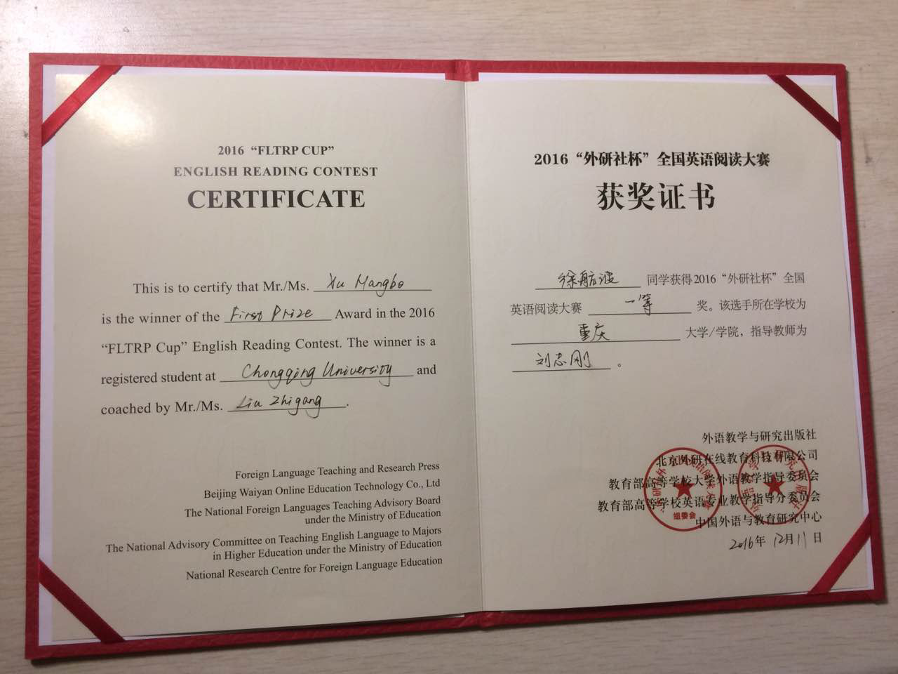 2014级英语专业学生徐航波在指导老师刘志刚的带领下,前往北京参加第二届“外研社杯”全国英语阅读大赛。徐航波同学在比赛中获得了全国一等奖第一名的优异成绩(全国排名第四),刘志刚老师荣获指导老师一等奖。