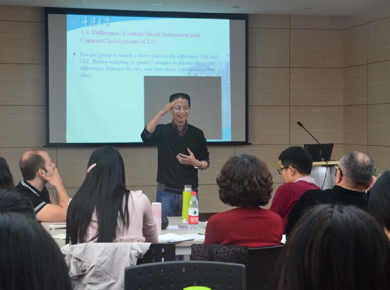 的三十多名中外籍教师进行了互动与讨论。余渭深教授以教师自身的教学反思开始引导教师对CBI教学的理解,并对其实施理据、实施原则、实施目标以及实施效益进行了分析,指出学生在基于内容的真实语境下的交流会促进学生语言的习得,即学生是在用中学—Learning by Using.余渭深教授强调老师在设计课程时目标的设定是依托某些学科领域的内容来发展学生的语言能力,也就是在教学设计中教师始终应将学生的语言发展作为一个重要目标,同时兼顾到内容的趣味性、适切性。余教授指出,在语言课堂中,学生能运用所学的语言表达出内容,这才达到了语言教学的目的。