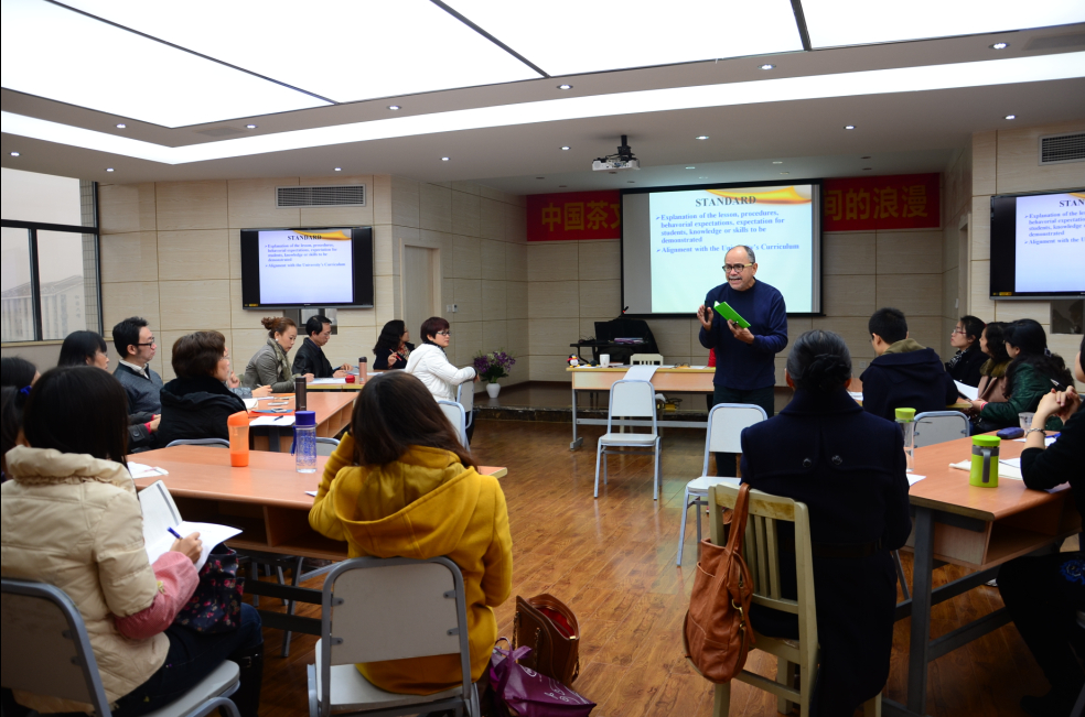 外教Pedro来自美国,在美国旧金山大学获得教育管理硕士学位,同时在旧金山州立大学获得另一教育学硕士学位。Pedro在亚洲的日本、印度尼西亚、中国教学长达34年之久,对于亚洲学生的英语学习状况非常了解,有着非常丰富的教学和教学管理经验。在和大学外语教学委员会进行了听课情况汇总和磋商后选择了教学中非常重要的一个因素lesson planning进行研讨。
