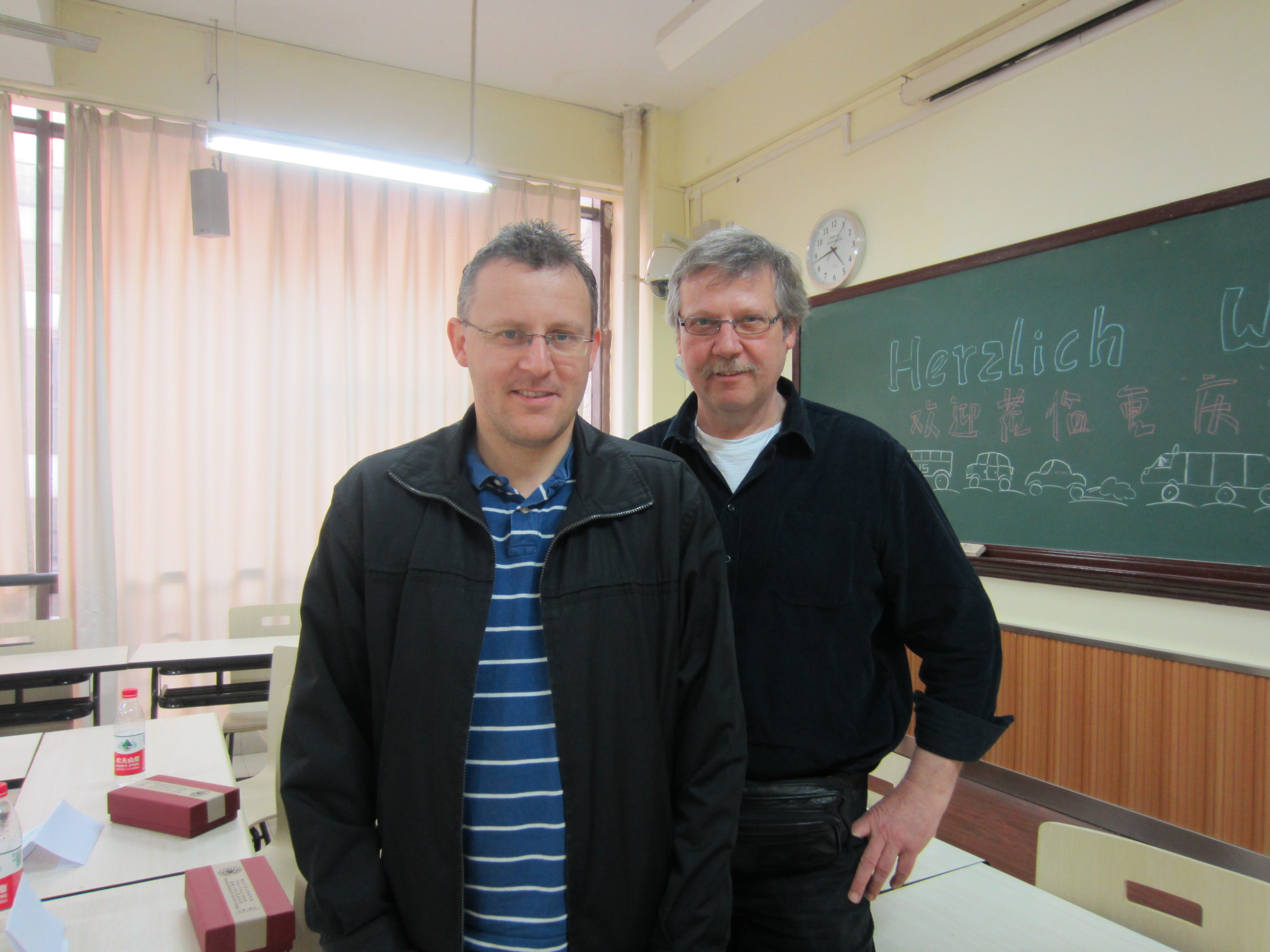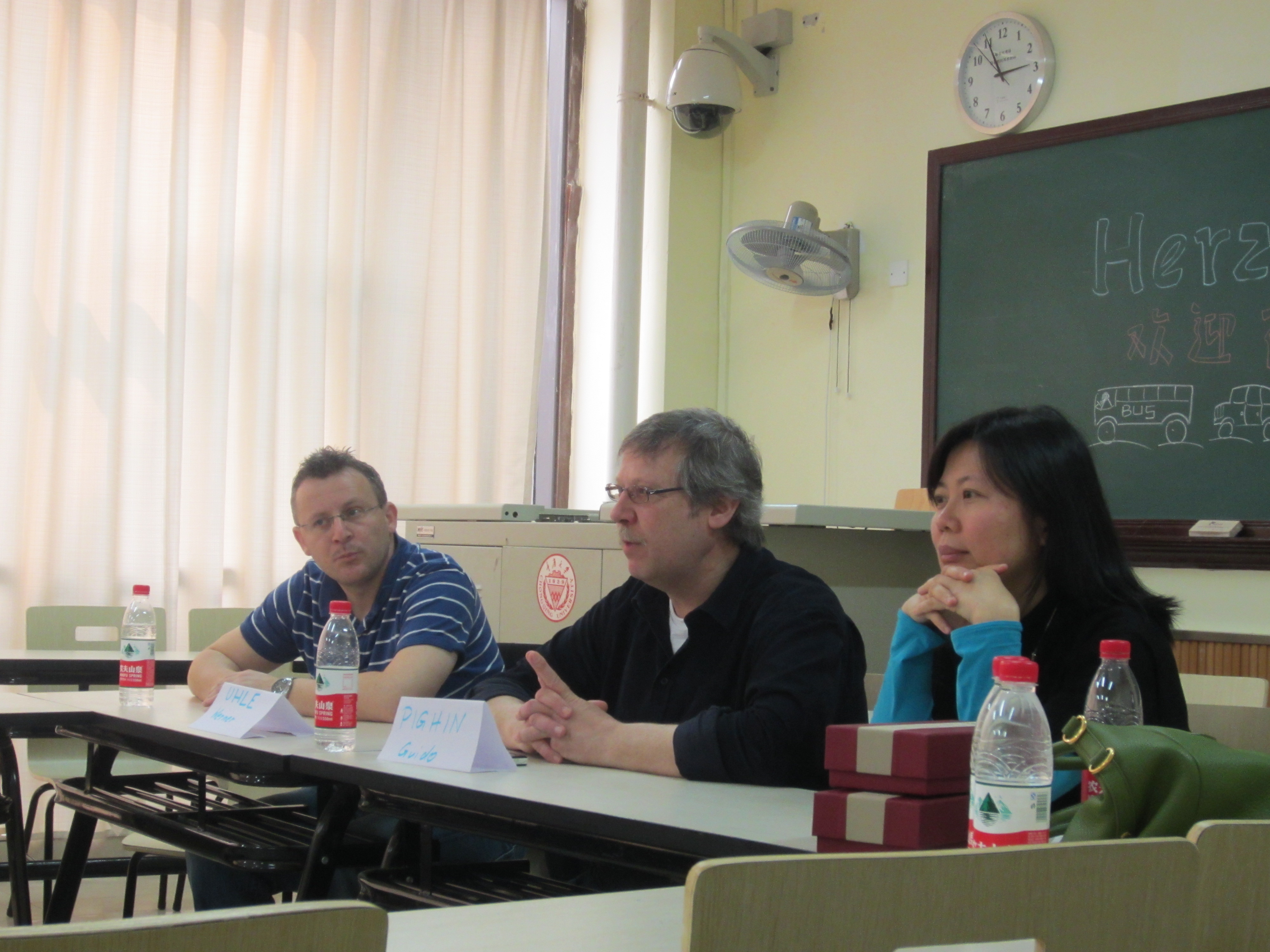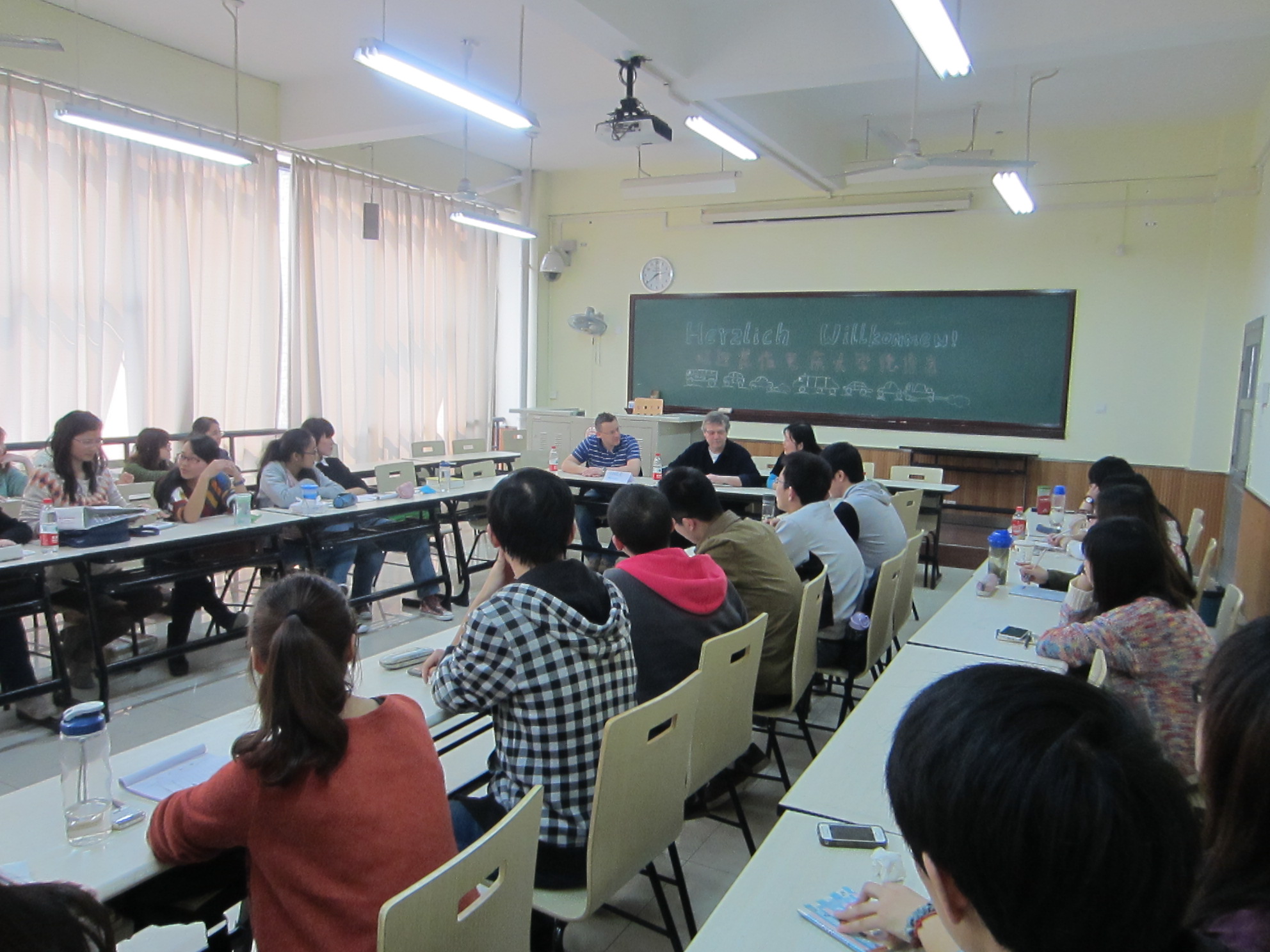 这次作为德企高管列席的德国友人是来自德国汽车制动系统的龙头企业Knorr-Bremse公司的 Uhle先生及高级工程师Pighin先生。他们利用此次在重庆暂驻之宜应德语专业之邀前来,为德语专业的同学指明未来工作,就业的方向并和同学们交流了一些他们自己的经验与心得。本次见面会于3月9日下午两点半在综合楼306教室准时举行。首先由耿晓云老师向大家介绍了本次见面会的具体安排,本次见面会分三个阶段,第一阶段为高管的自我介绍,第二阶段高管就在德企实习,应聘以及工作初期的各个方面进行了阐述,第三阶段为答疑解惑时间。