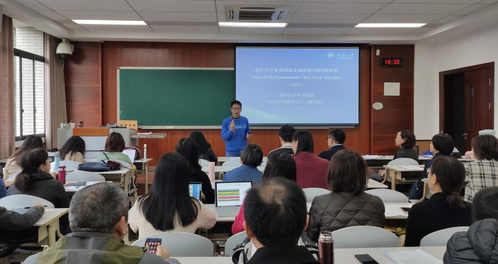 李小辉副院长向老师们解释了测试改革的目的及意义,汇报了《框架》研发的过程。测试团队首席专家余渭深教授详细地阐释了框架的构成,并以1级样题为案例向大家分析了各类题型的测试目标,以及其可能对教学产生的反拨效应。大学英语老师们结合自己的课堂教学实际,积极地与研发团队进行了深入地交流。