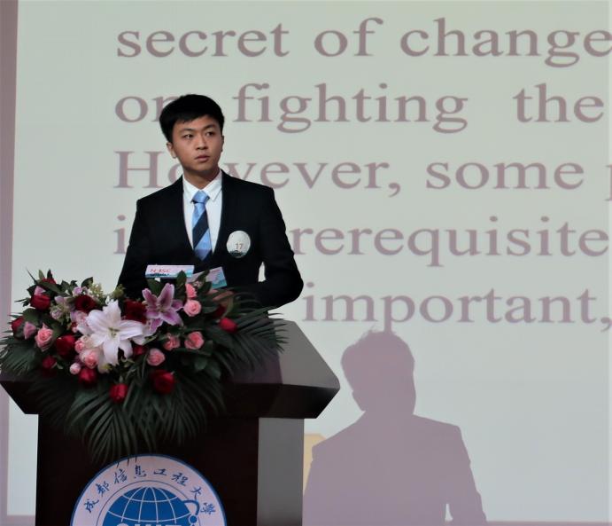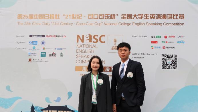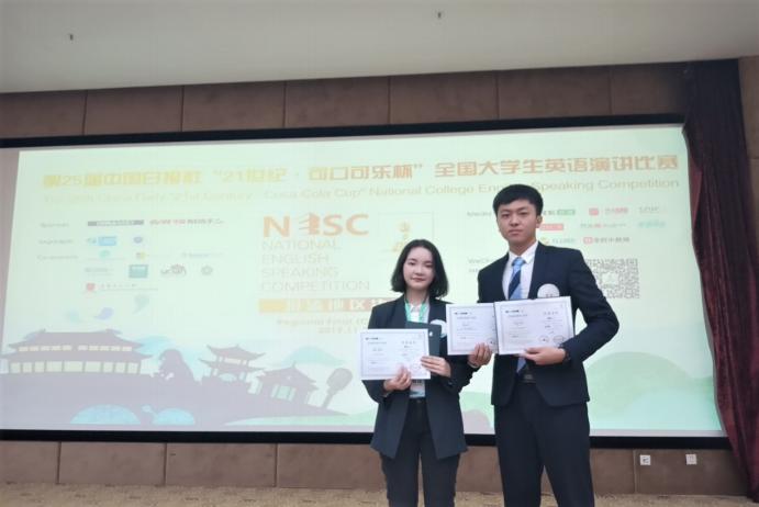 杨阳同学和翟诗文同学冷静审题,激情演讲,机智应答,凭借流畅自然的发音、大方得体的肢体语言、敏捷的反应能力等赢得了台下观众经久不衰的掌声,短时间内给评委和观众留下了深刻的印象,最终在激烈的比赛中取得可喜成绩。