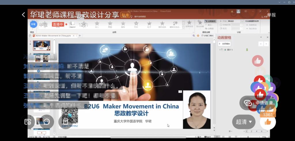 华珺老师的直播课内容选自上海外语教育出版社全新版大学进阶英语第二册第六单元的《中国的创客运动》,教学重点放在《中国创客空间的经验》和《中国制造的2.0时代》这两篇文章上面。两篇课文分别介绍了中国的第一家正式的“创客空间”,位于上海的“新车间”和深圳的第一家“创客空间”——“柴火空间”,通过这两个创客空间展现了创客运动在中国的发展现状和意义以及政府对创客运动的支持。华珺老师所讲授的课文中提取三个方面的内容来融入思政元素:1)对“maker”的解读,2)中国制造业现状以及创客运动对中国产业的意义所在;3)国家和地方政府对创客运动的支持和鼓励。华老师在讲授课文的过程中鼓励学生结合李克强总理提出的“大众创业,万众创新”进行拓展阅读,并且思考自己未来的规划如何与国家战略更好地结合起来,为祖国建设发挥自己的作用。该课程的综合技能训练部分既是课文学习的拓展,又有思政元素导入的空间,通过CGTN“Amazing China”的视频材料设计一组围绕听、说、读、写、译的综合技能训练活动,在培养学生语言能力的同时有机融入思政元素。