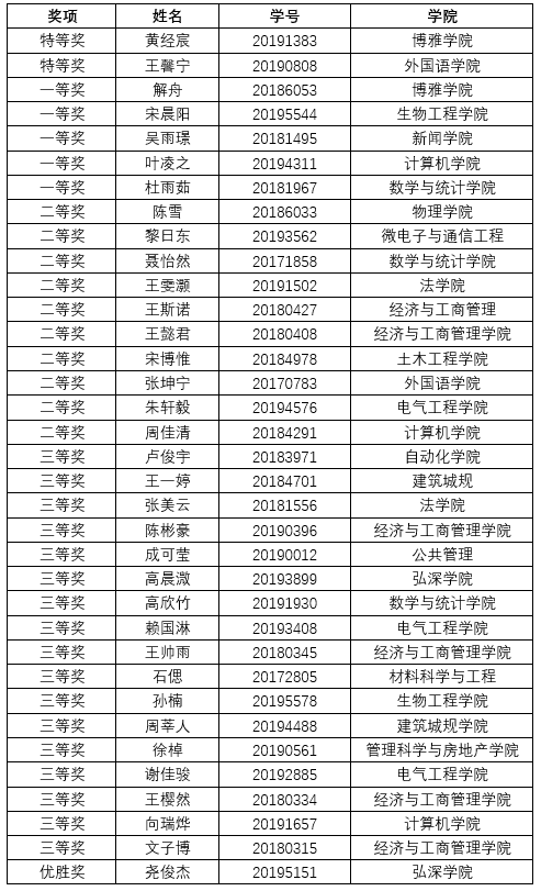 的王馨宁同学荣获校级特等奖,来自博雅学院的解舟和生物工程学院的宋晨阳等同学荣获校级一等奖。