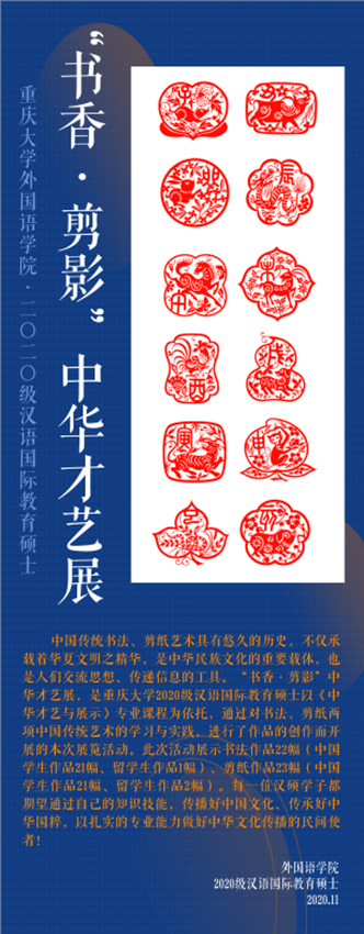 中华文化博大精深,源远流长。在其璀璨的发展历程中更是孕育出书法和剪纸两项文化瑰宝。阳春白雪和下里巴人相结合,彰显了中华文化兼容并蓄、海纳百川的特点。汉语国际教育作为一项国家和民族的事业,是我国积极推动“一带一路”战略的协助者,对增强国家软实力、提升我国文化自信有着至关重要的作用。学好中华文化,推动中华文化走向世界是每一名汉硕学子都应该身体力行的职责。想要通过润物细无声的方式开展中华文化教学活动,汉硕学子们首先就要夯实自身:学好中华文化、练好中华才艺。