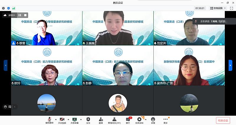 随后,研修班其余五位主讲人分别对中国英语(口译)能力等级量表的内容解读、研制过程、应用研究、未来展望等方面作了全面、深入、细致的阐释。第一讲由王巍巍老师主讲。她首先从整体层面介绍了CSE的研发背景和内容框架,阐述口译量表的定位、构念、定义与框架,并通过具体例子对口译量表各级别的层级特征及实践意义进行细致解读。为了深入剖析量表对课堂教学的指导意义,王老师还以口译量表为例,从学习目标设定、练习材料选择和口译质量评估三个方面,深入浅出地阐明了CSE对外语教、学、测的应用价值。许艺老师在第二讲中则聚焦中国英语(口译)能力等级量表研制的技术维度。她从量表描述语收集、整理、修改到描述语定量与定性分级验证,详细剖析了口译量表描述语分类验证和分级验证的全过程,并以高度凝练的思维导图对中国英语(口译)能力等级量表在英语教学、学习、测评等方面的应用前景作了展望,为量表未来研究提供了丰富启示。