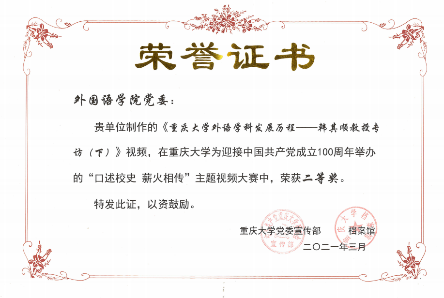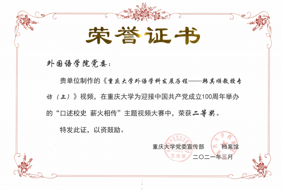 在新千年发展壮大夯实基础,贡献卓著。此次参赛作品是由韩其顺教授口述院史的部分内容组成,历经3个月的资料整理、视频拍摄和剪辑。作品的形式为访谈,韩其顺教授从三个时间段讲述了外语学科的发展历程:积健烽火炽,名家荟萃时(1932-1952);建国大业兴,外语正分兵(1952-1976);改革春风起,复立中流砥(1976-1987)。