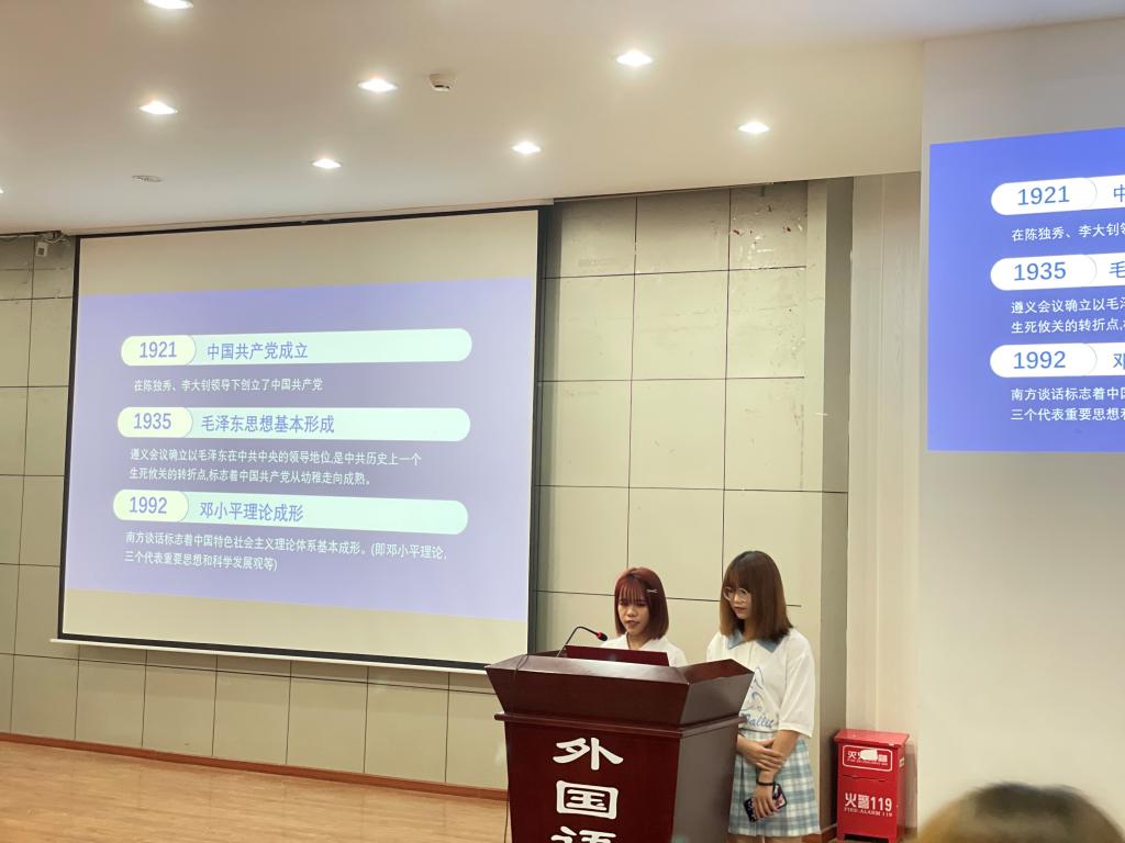 本次活动的室内部分包括齐唱国歌、党史分享、五四精神演讲、红岩精神演讲及抗击疫情感悟分享等多个环节。在全体同学起立齐唱国歌后,由自动化学院农羽馨、雷腕萤同学带来百年党史主题演讲,她们从历史脉络、发展启示、伟大贡献三个方面回顾建党百年的光辉历史,鼓励同学们在对历史的深入思考中做好现实工作,更好地走向未来,不断为中国特色社会主义事业贡献力量。