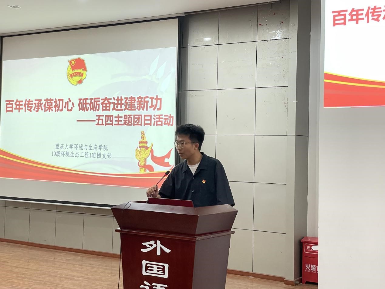 随后,环境与生态学院的赵程同学就五四精神的回顾与传承进行演讲,他带领同学们回顾与学习五四精神的历史内涵,鼓励同学们积极学习五四先驱崇高的爱国情怀和革命精神,以宋玺、秦玥飞等人为例,号召全体同学立足当下、砥砺奋进,争做“有理想、有本领、有担当”的时代新人。
