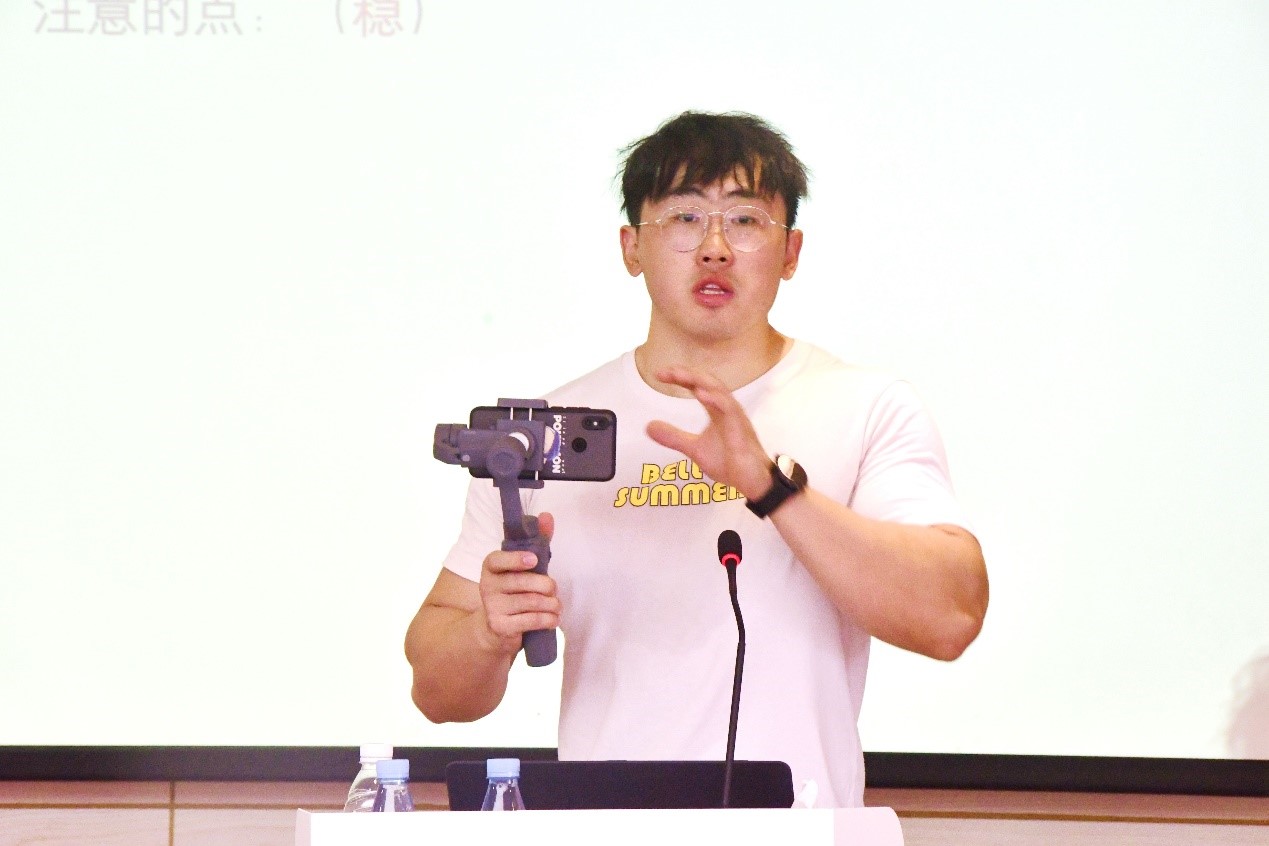 于老师对摄影基础、视频基础、后期制作与实践应用三个方面进行了分享与讲解。从相机工作原理入手,于老师用简洁明快的语言讲解相机的参数设置等相关理论知识,还展示普及了专门携带的摄影摄像装备。针对学院宣传工作的摄影摄像需要,于老师特别分享了黄金分割点、三分线等构图方法,提出“丰富”是拍摄学生活动照片的关键法宝。