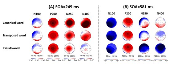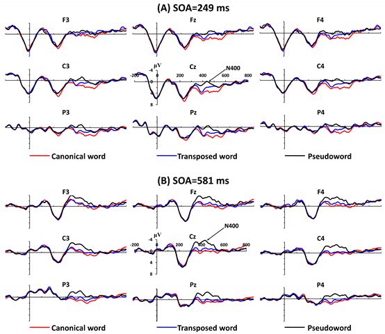 语言认知及语言应用研究基地曹洪文团队在国际神经语言学著名刊物Journal of Neurolinguistics发表研究论文—“Electrophysiological correlates of character transposition in two-character Chinese word identification”。该研究采用事件相关电位技术(event-related potential,ERP)和双任务快速序列视觉呈现范式(dual-target rapid serial visual presentation task,RSVP)考察词素位置编码的认知神经机制。研究发现:N100和P200成分反映早期的视觉特征加工,N250成分反映中文复合词亚词汇词形到整词词形的映射过程,N100、P200和N250成分对中文复合词的词素位置编码并不敏感;N400反映词汇的整体激活以及整词水平的表征到语义表征的映射,词素位置编码会诱发更负的N400波幅,表明词素位置颠倒影响中文复合词语义提取。
