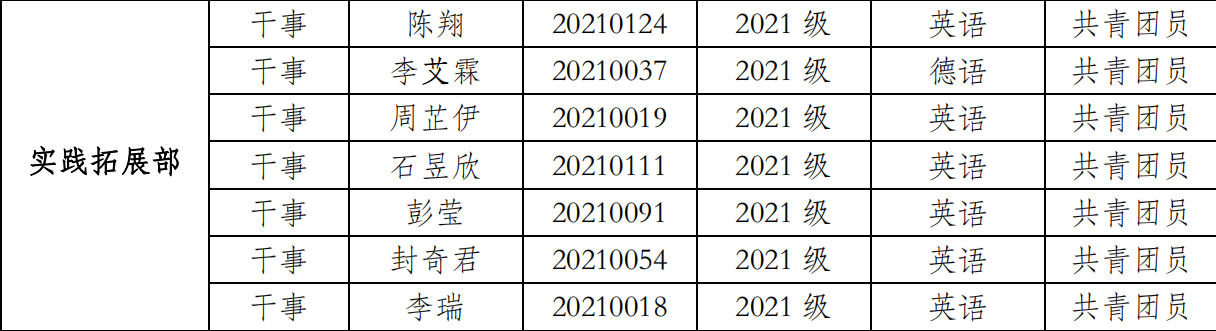 根据学生自主报名,经 伦理电影 团委学生会资格审查、面试等环节考核,并报学院团委审核批准,现研究决定拟录用以下学生为 伦理电影 2021-2022 学年度团委学生会干事。现将具体名单公示如下: