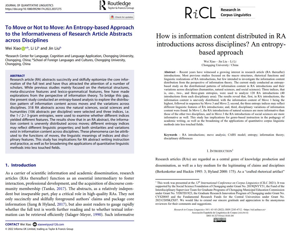 论文How is information content distributed in RA introductions across disciplines? An entropy-based approach发表于西班牙语料库语言学会会刊Research in Corpus Linguistics2022年第1期。该文同样从信息科学的视角研究学术英语,结合Shannon信息论和Swales体裁分析CARS模型,测量了120篇自然科学、社会科学和人文学科论文摘要各语步的一、二、三元组香农熵,探讨了学术论文引言的信息分布模式及其学科差异。研究发现:学术论文引言中的信息量呈不均衡分布,各语步信息量从高到低依次为语步一“确立研究领域”、语步三“填补研究空间”和语步二“建立研究空间”;不同信息量测量指标可能反映了学术论文引言不同的语言特征;学术论文引言信息分布模式存在学科间的异同:自然科学论文引言的语步一信息量更高,社会科学论文引言的语步三信息量更高,而无论何种学科的语步二信息量均为最低。本文对于基于体裁的学术写作教学,以及计量语言学研究方法应用范围的拓宽,均有启示和借鉴意义。肖巍博士为论文第一兼通讯作者,合作者为其指导的硕士生刘尽、李丽。Doi:10.32714/ricl.10.01.04